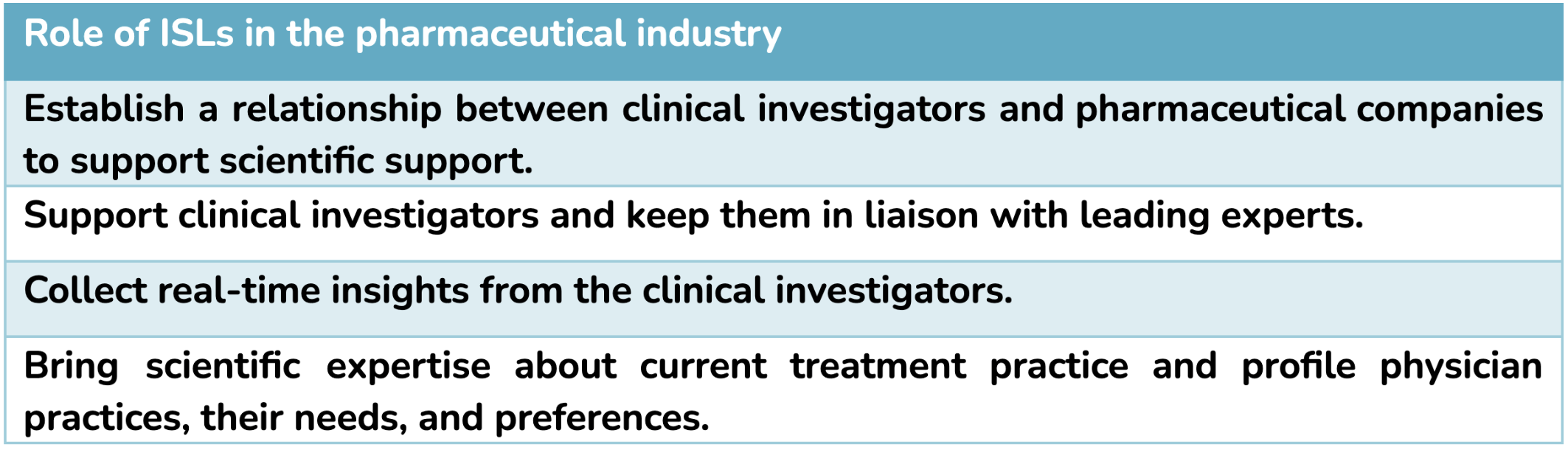 Specialized training programs ensure ISLs understand clinical trials, including their study design, regulatory requirements, and the overall trial development process. Focused training about clinical trials makes ISLs ready to collaborate positively with clinical investigators, establishing a connection between pharmaceutical companies and investigators.